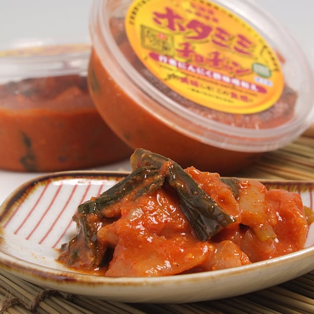 帆立貝ヒモ(北海道産)、コチジャン、行者ニンニク、味噌、砂糖、酢、唐辛子、ごま、みりん、ニンニク/調味料(アミノ酸等)、(一部に小麦を含む)