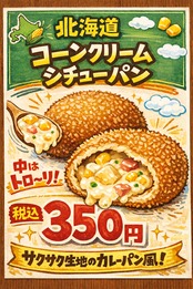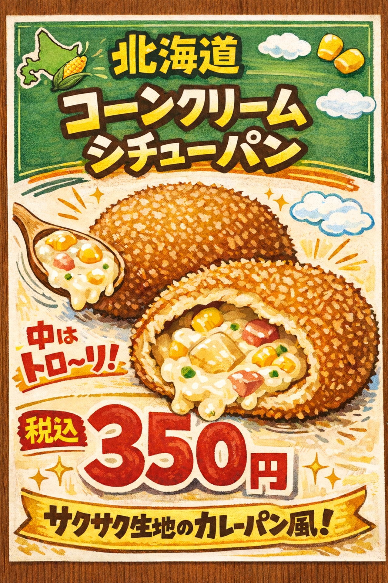 ありそうでなかった新感覚シチューパン新発売!北海道コーンたっぷりのシチューフィリングを北海道小麦と牛乳だけを使用したもっちり生地で包んでカリッと揚げました。
